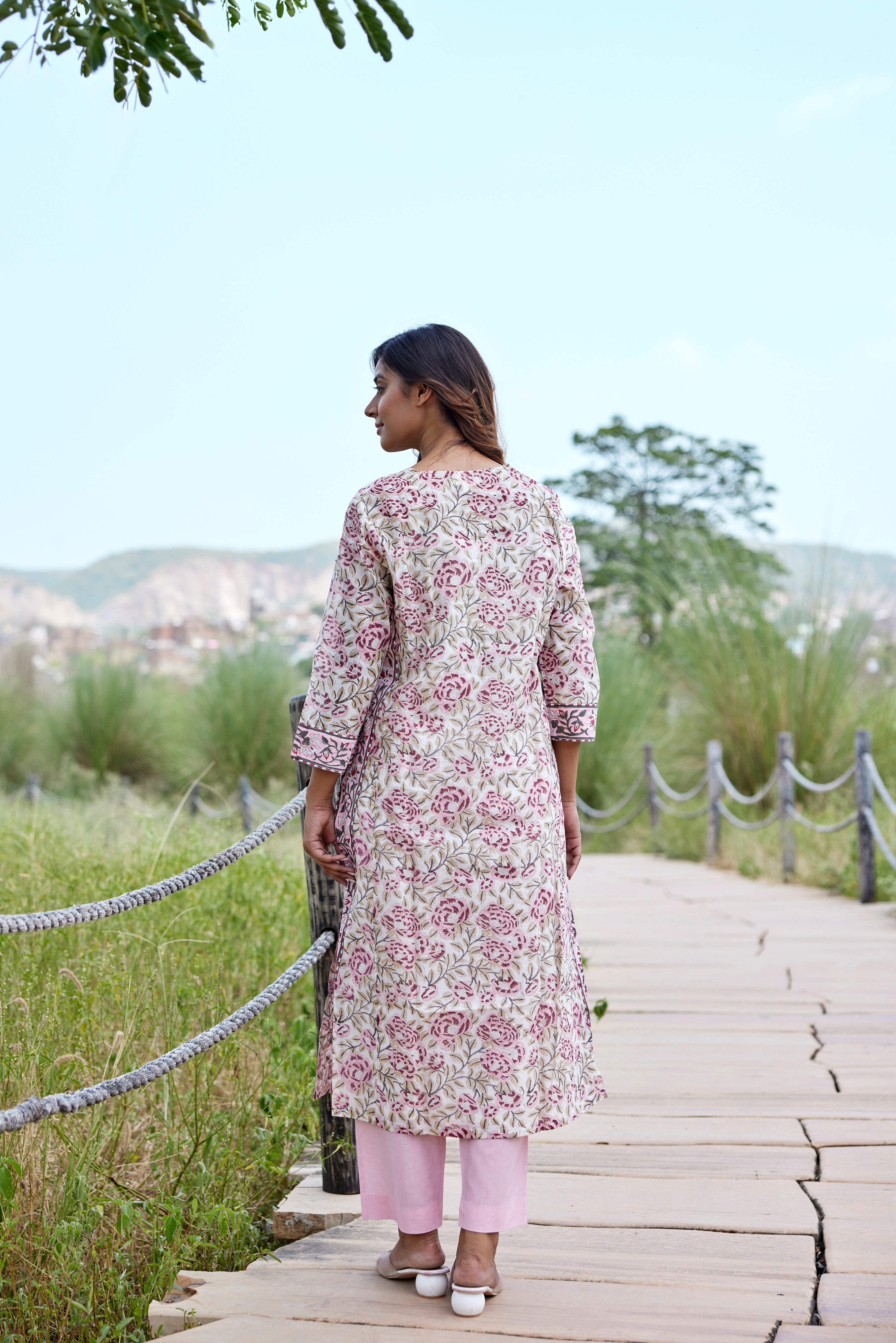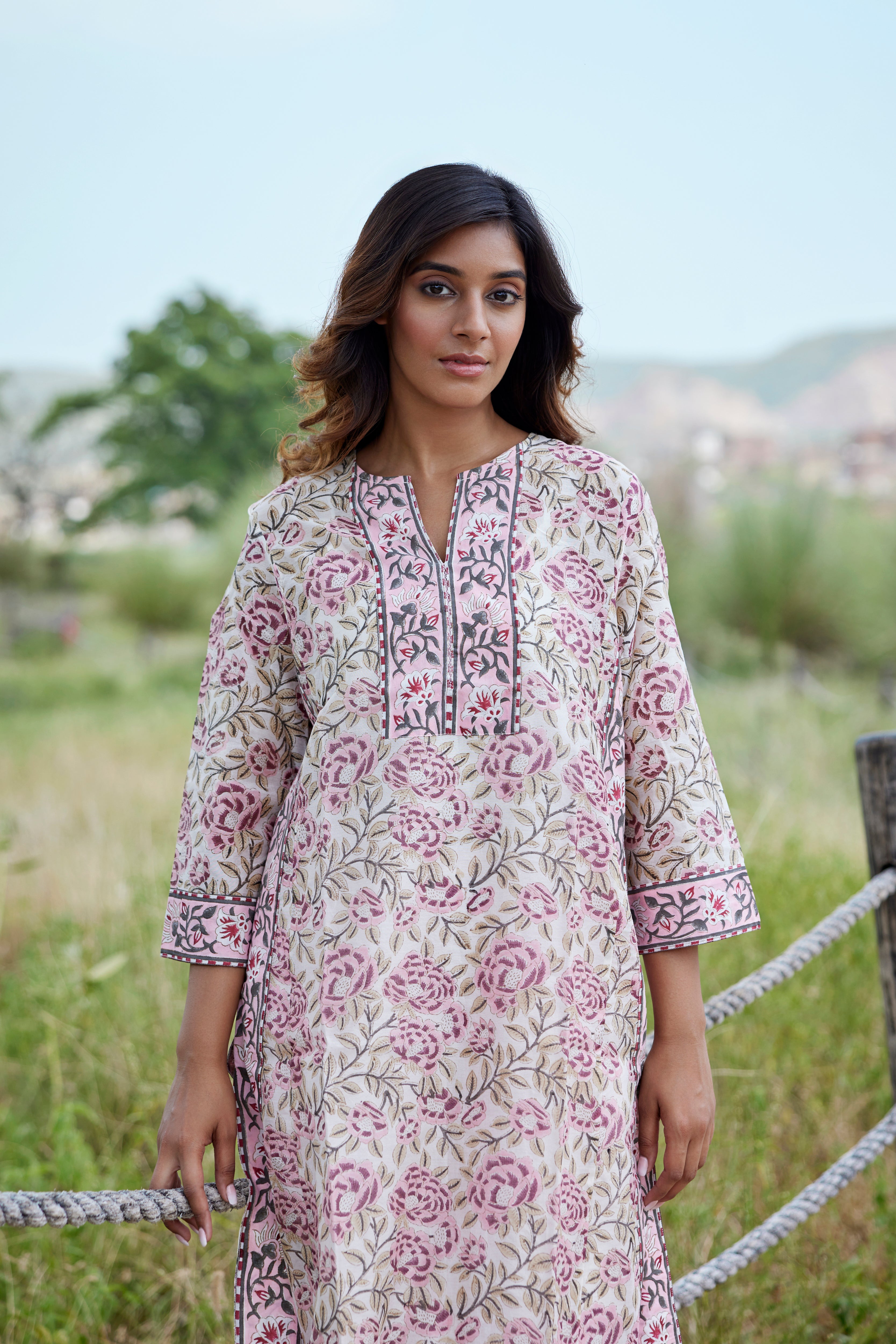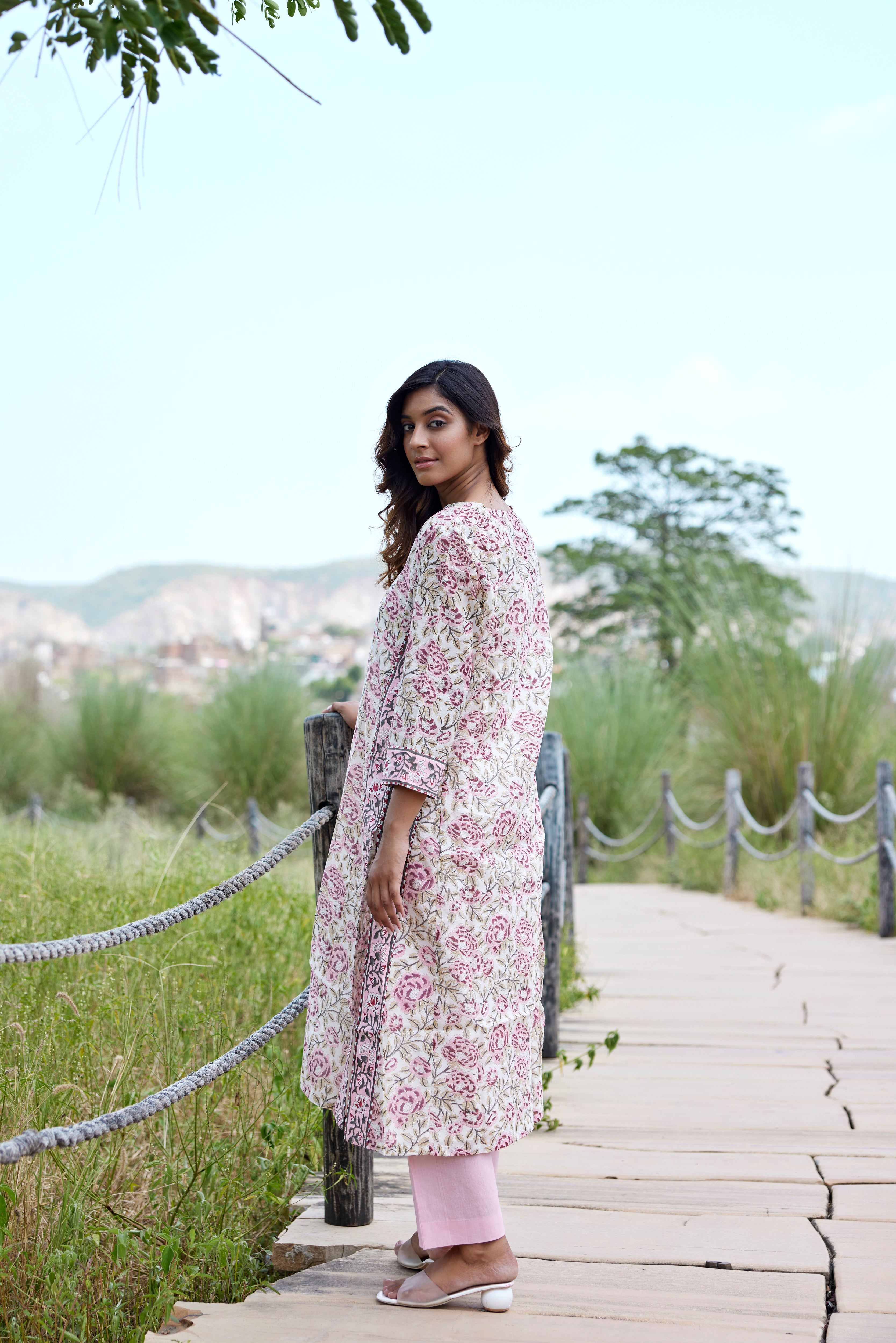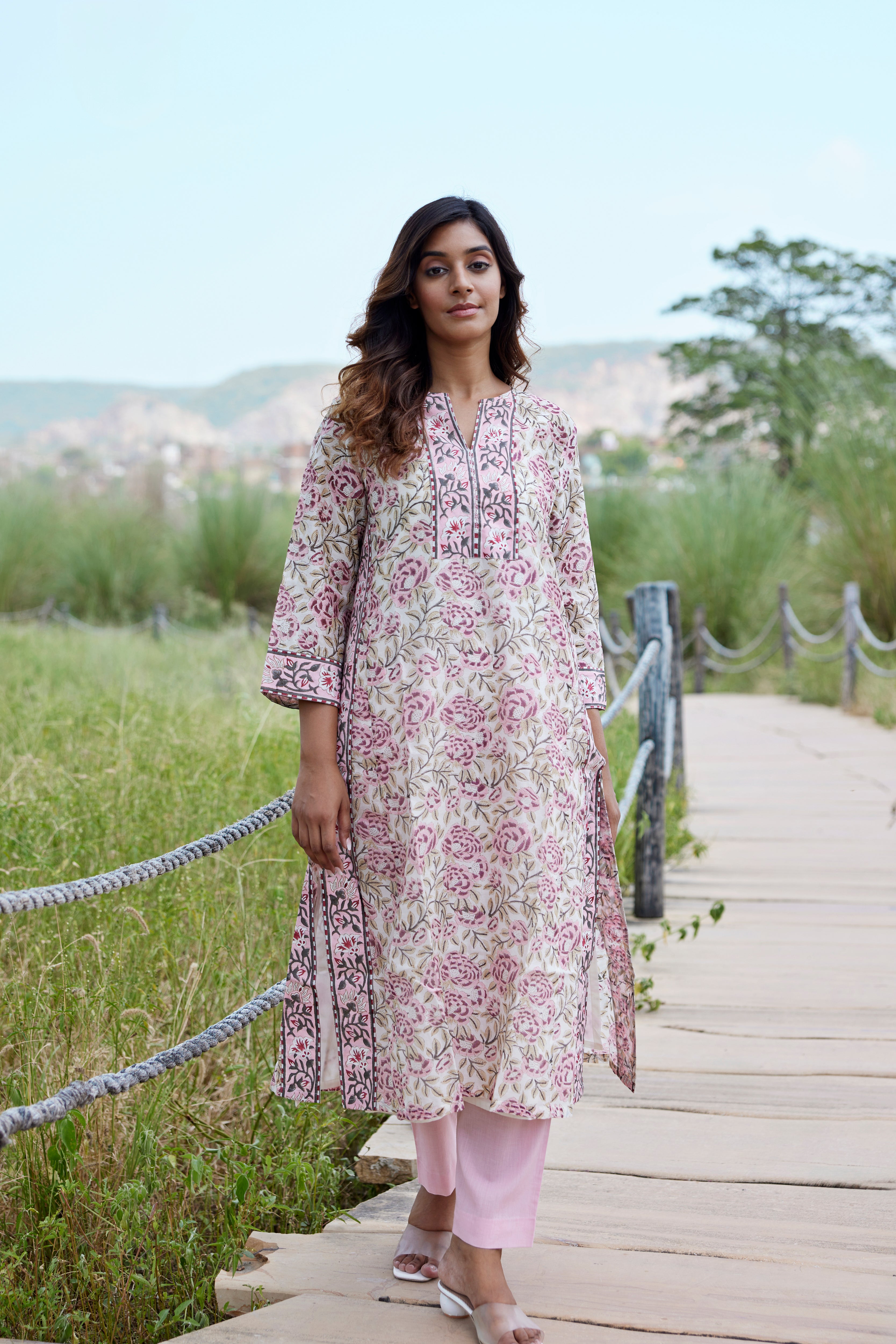 Detailing: Block print panel, boxy sleeve and gusset, border on side slit.