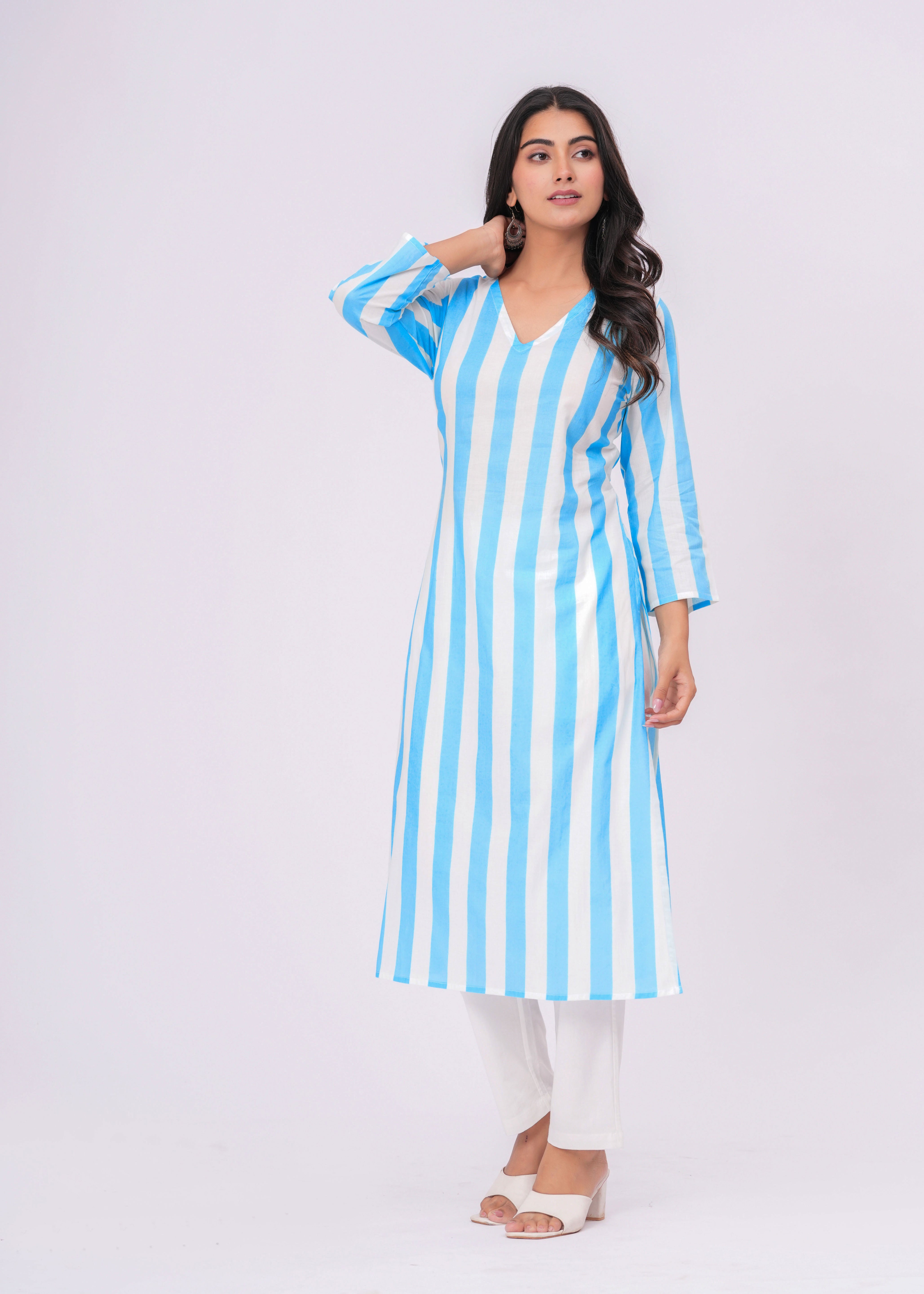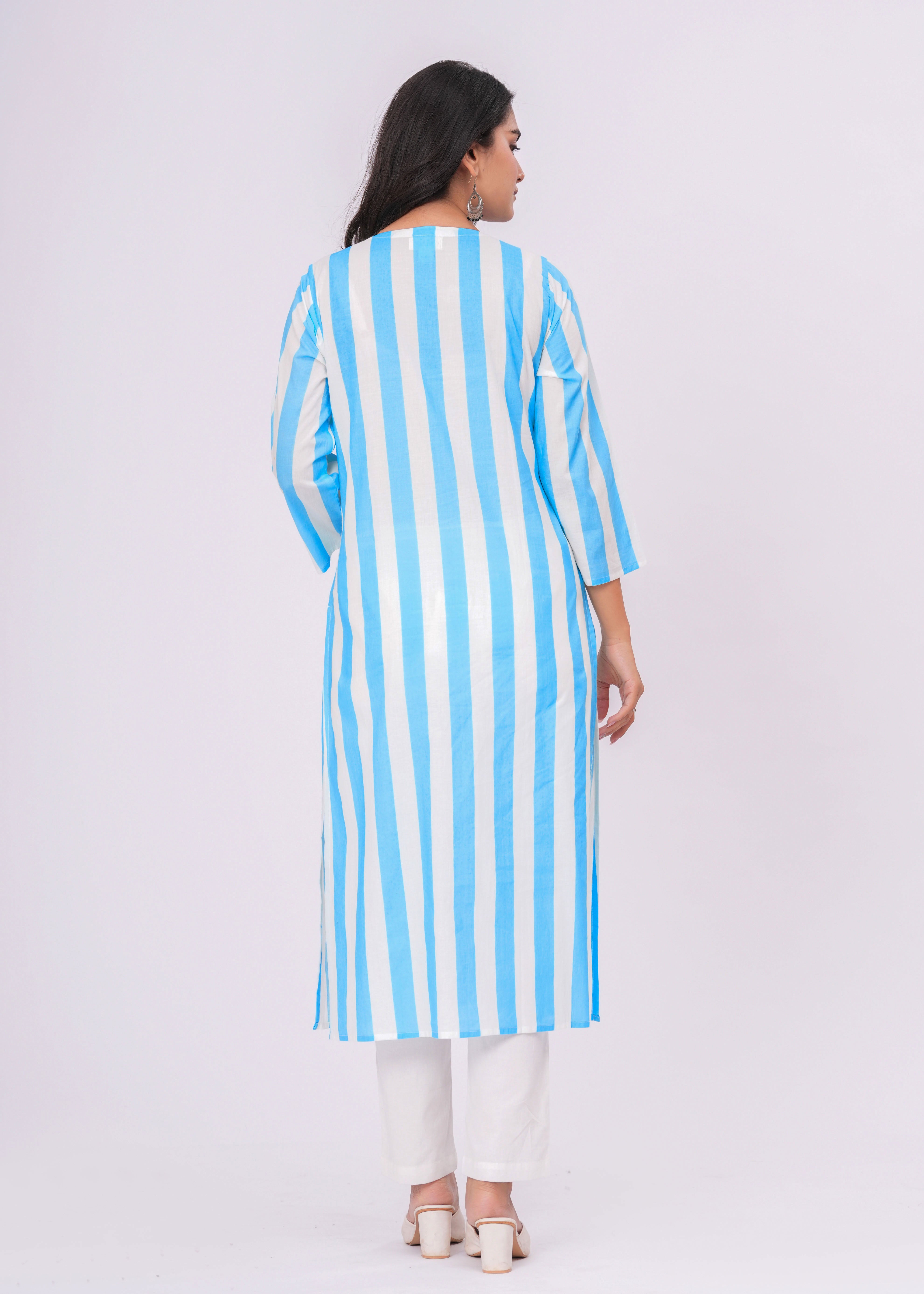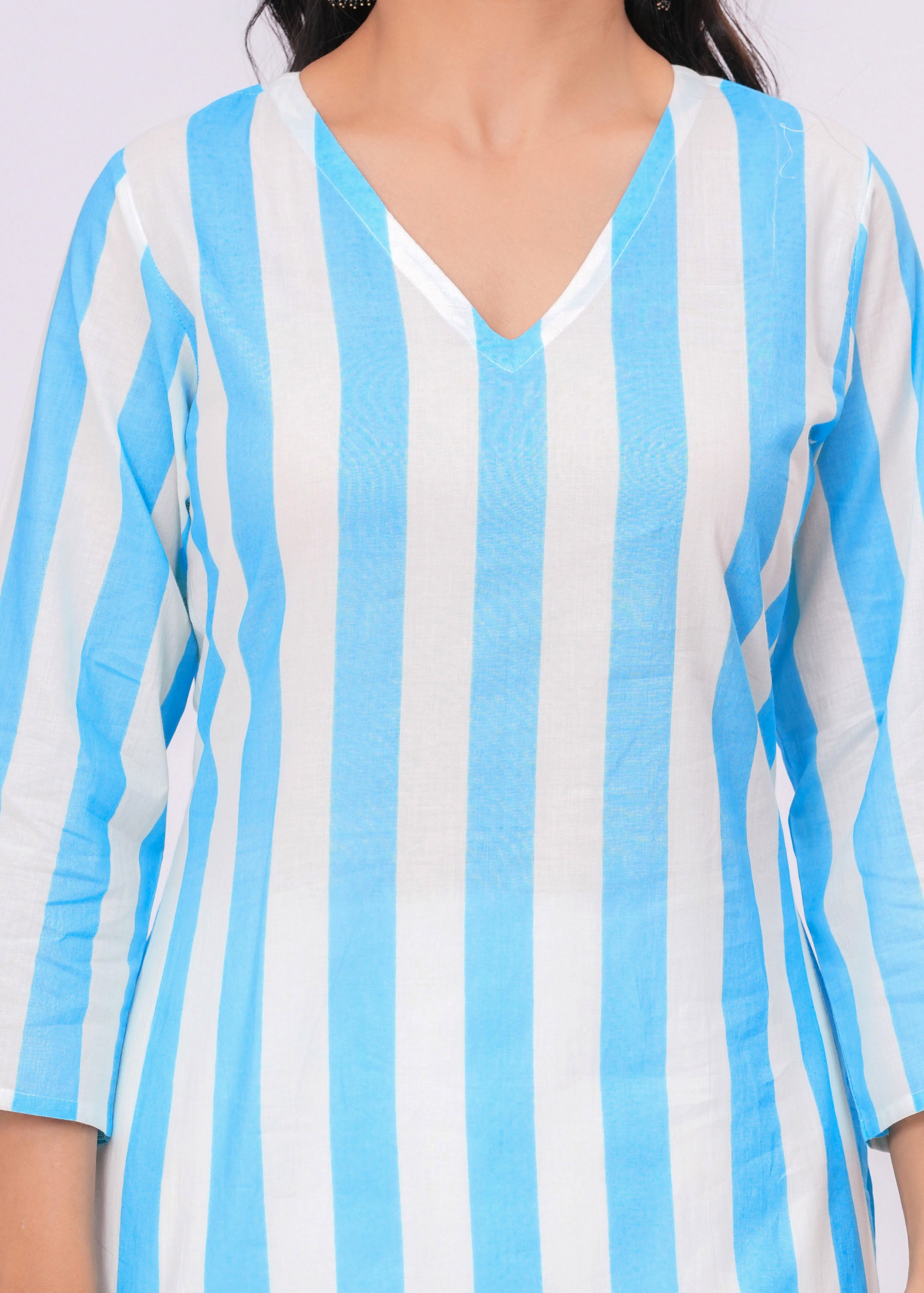 TURQUOISE/ WHITE STRIPE V- NECK KURTA
