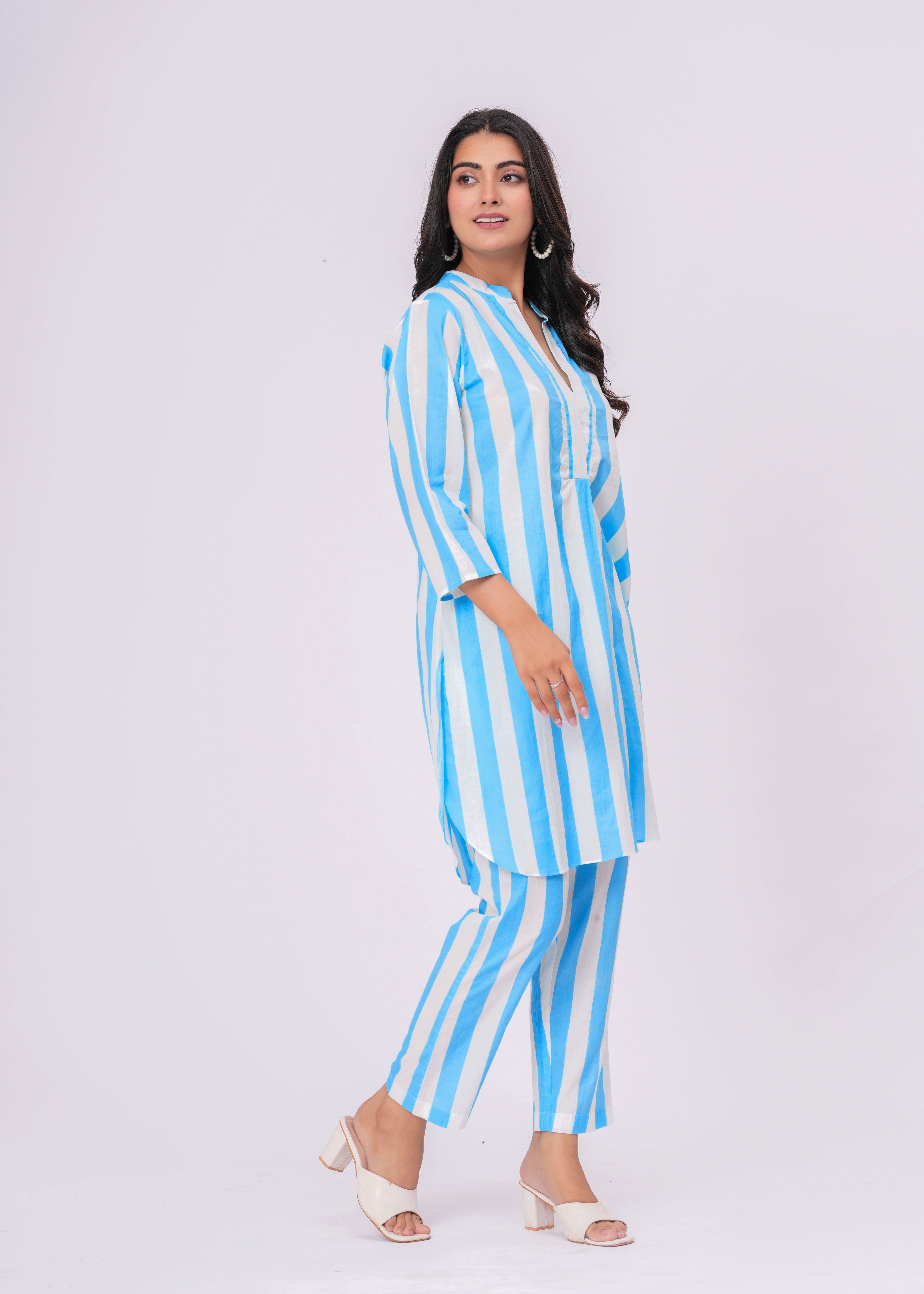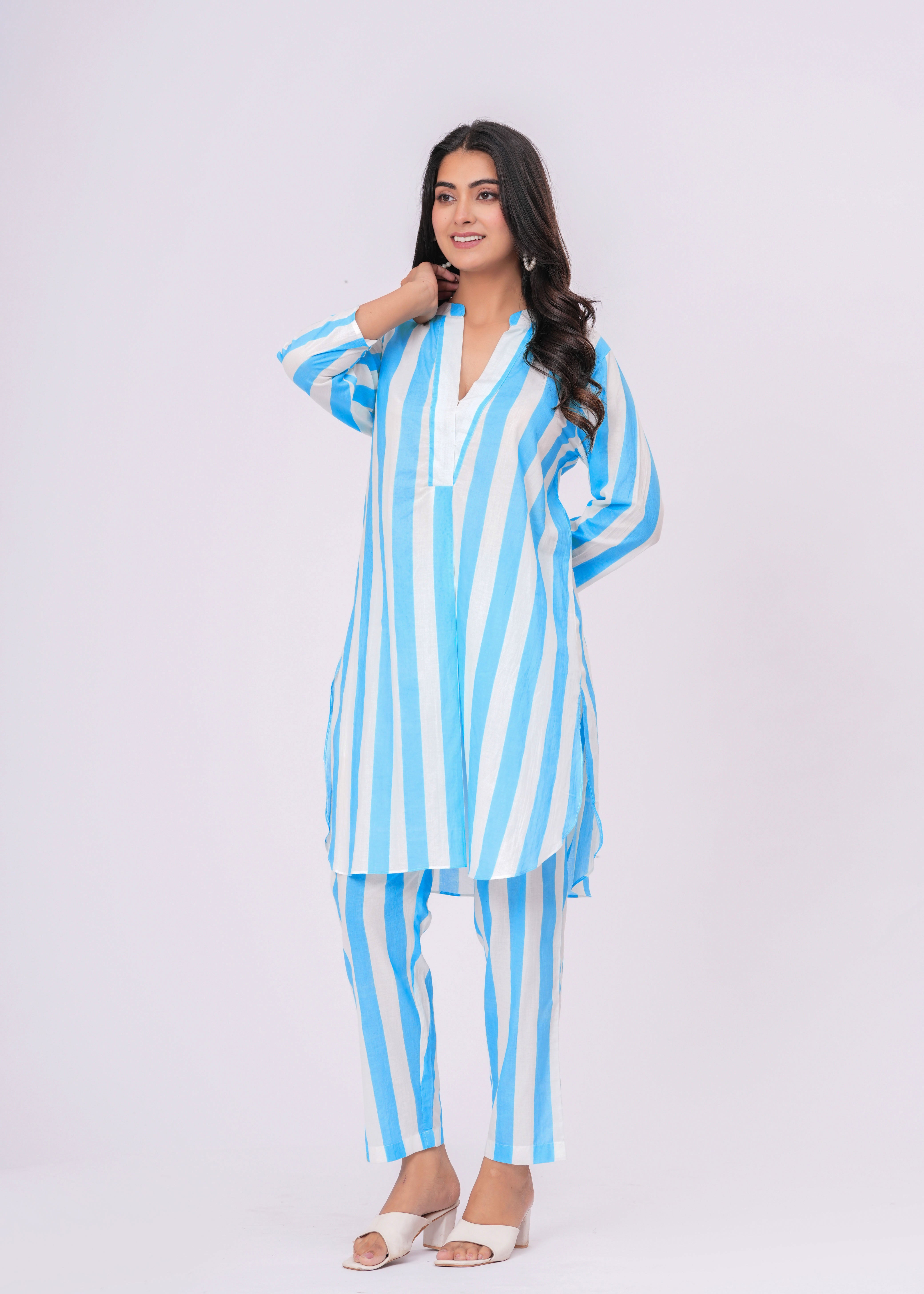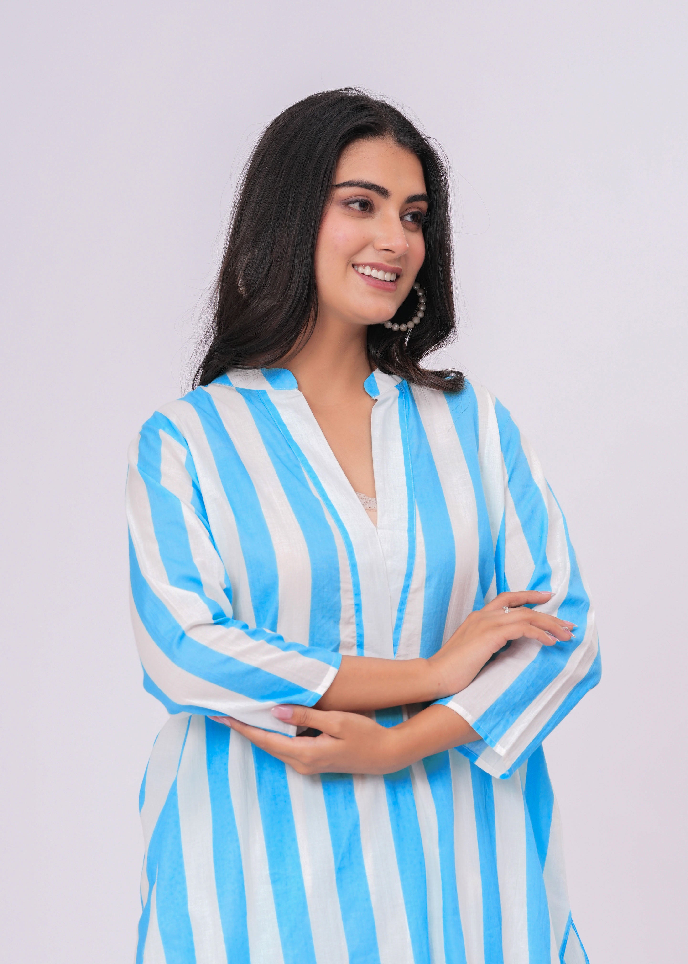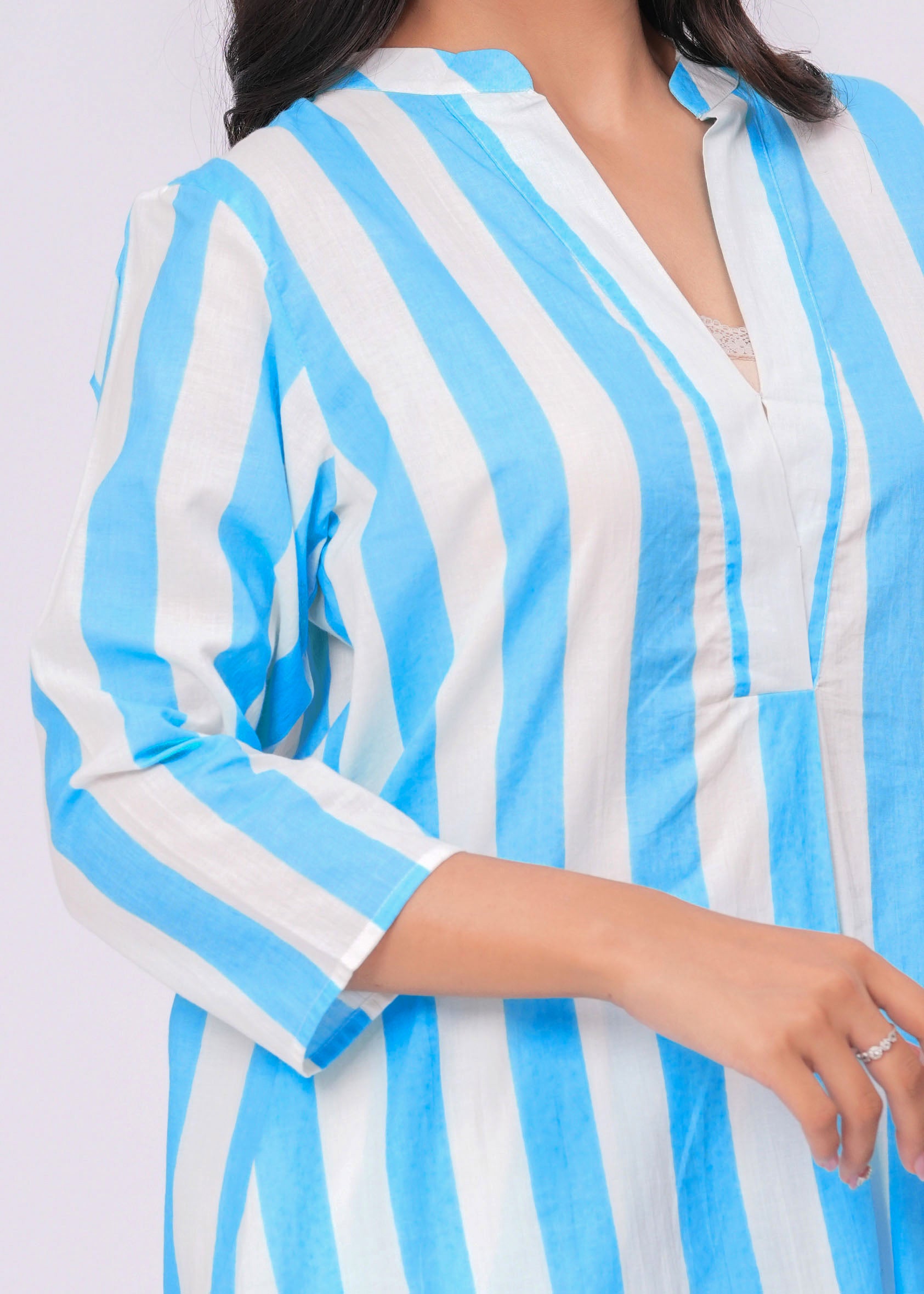 TURQUOISE/ WHITE STRIPE V- NECK KURTA
