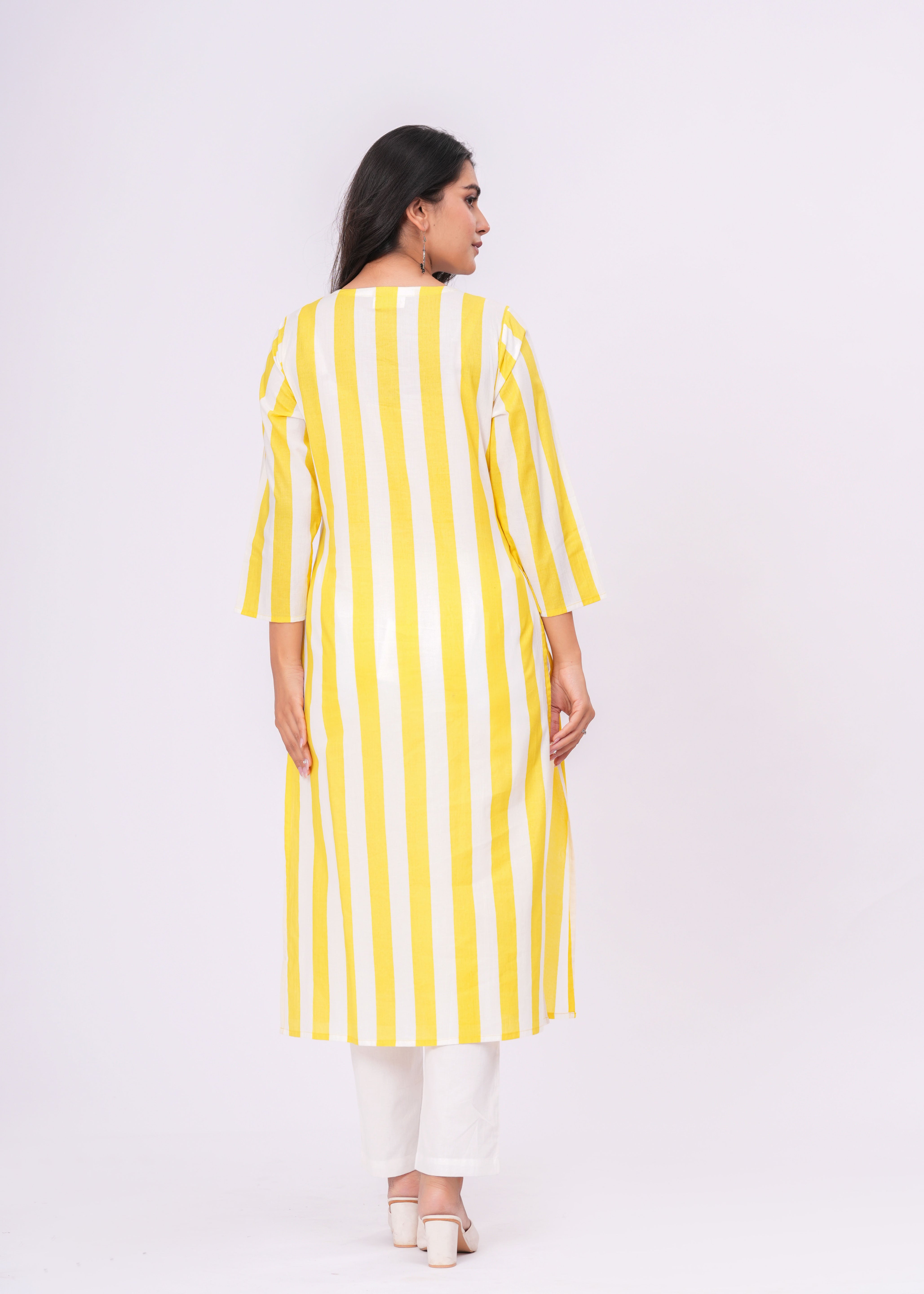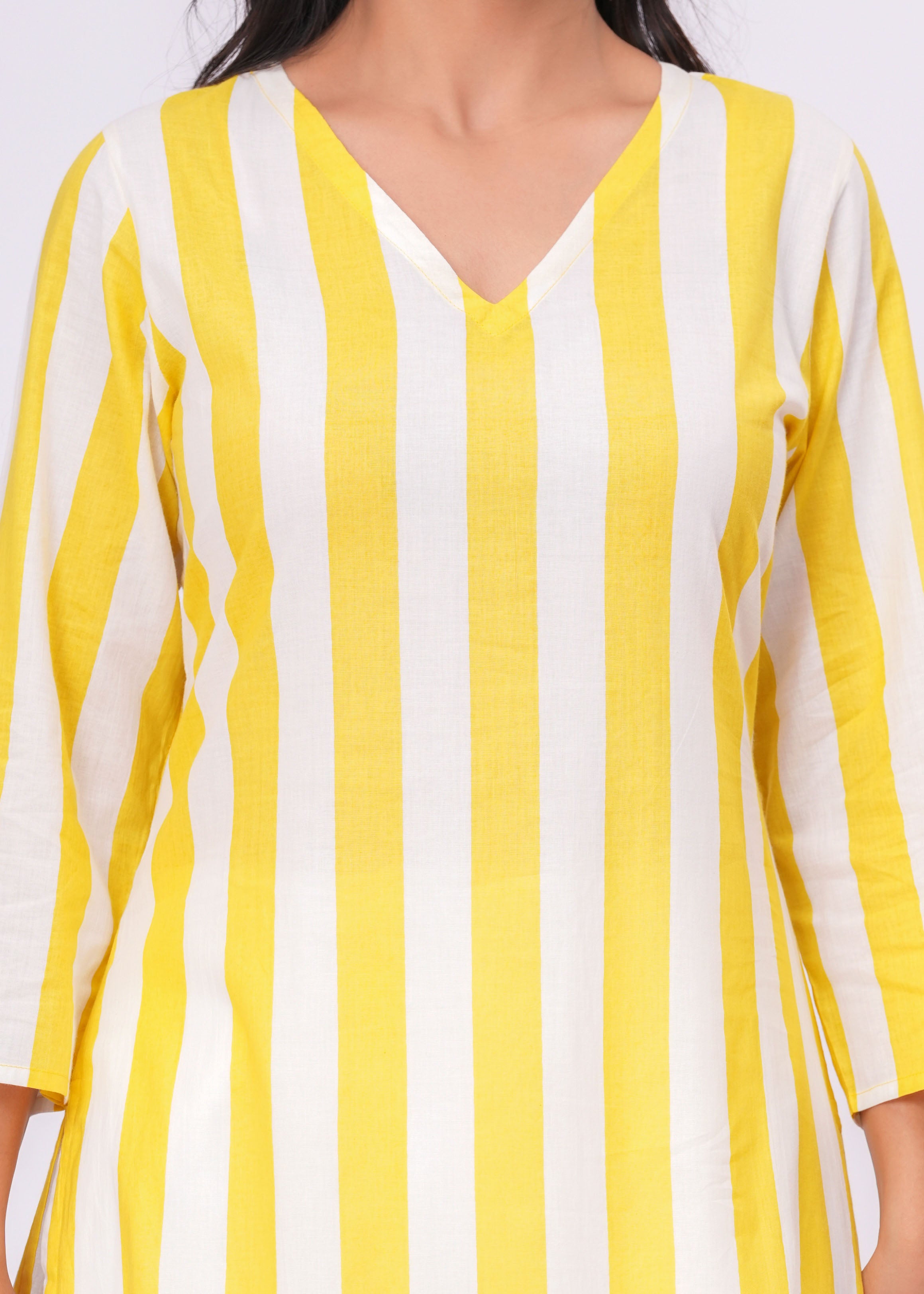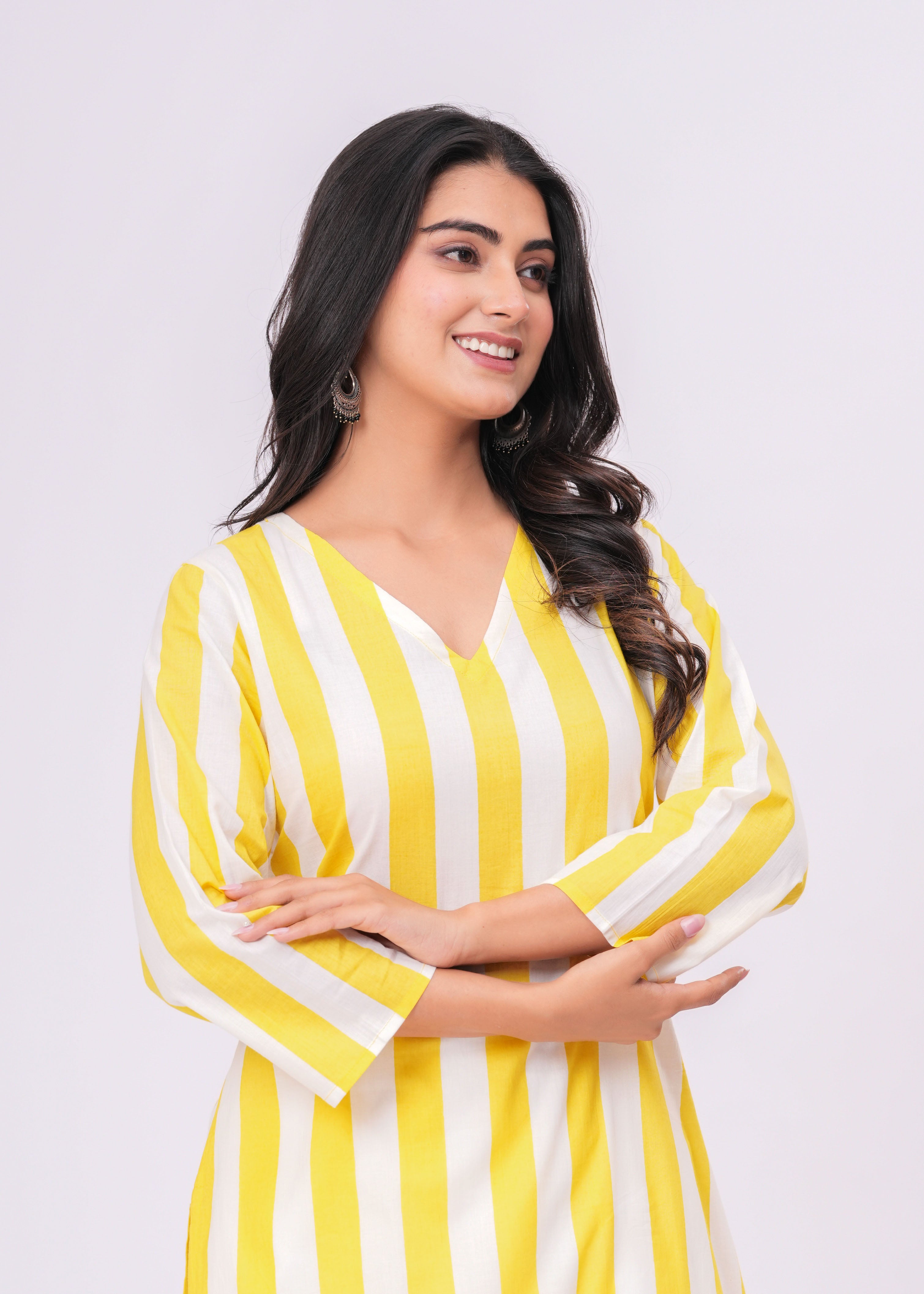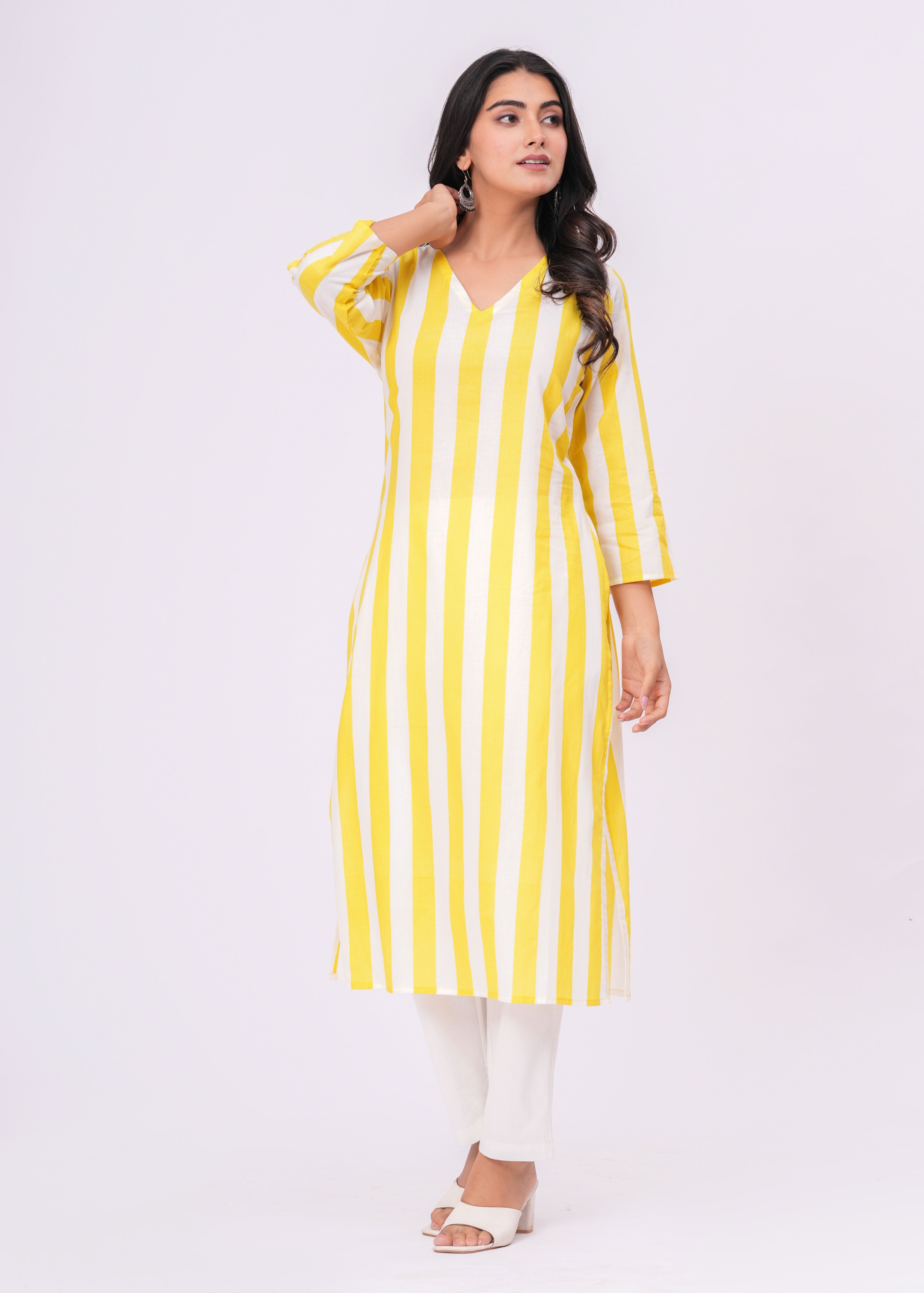 YELLOW/ WHITE STRIPE V-NECK STRAIGHT KURTA